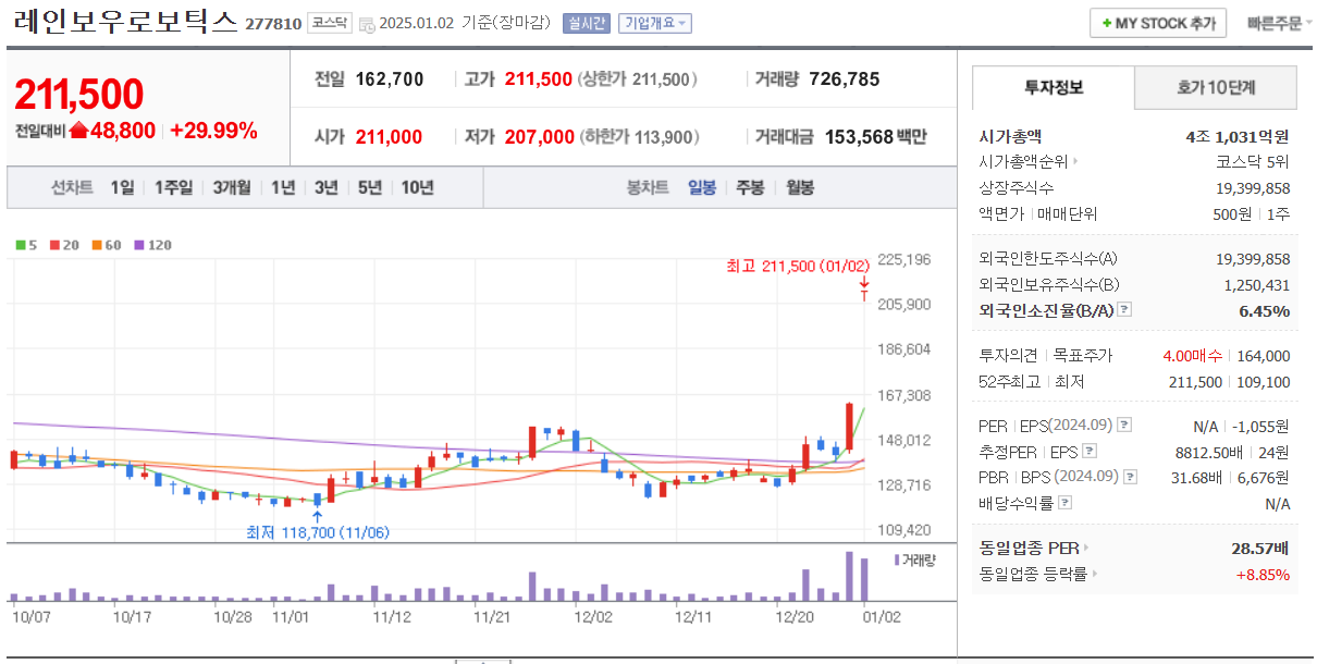 로봇 섹터중 관심도가 가장 높은 신규 상장주로 수익율이 가장 좋습니다. 링크 바로 클릭!!